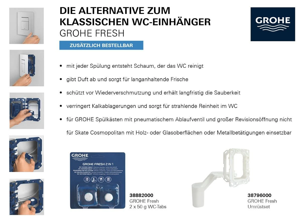 Grohe Fresh Umrüstset 38796 für die Aufnahme von Duft-Tabs mit pneumatischem Ablaufventil und kleiner Revisionsöffnung nicht für Skate Cosmopolitan mit Holz- oder Glasoberflächen oder Metall- betätigungen einsetzbar Halterahmen mit Öffnungsfunktion mit Behälter für die Aufnahme von Duft-Tabs für alle GROHE Betätigunsplatten 156 x 197 mm