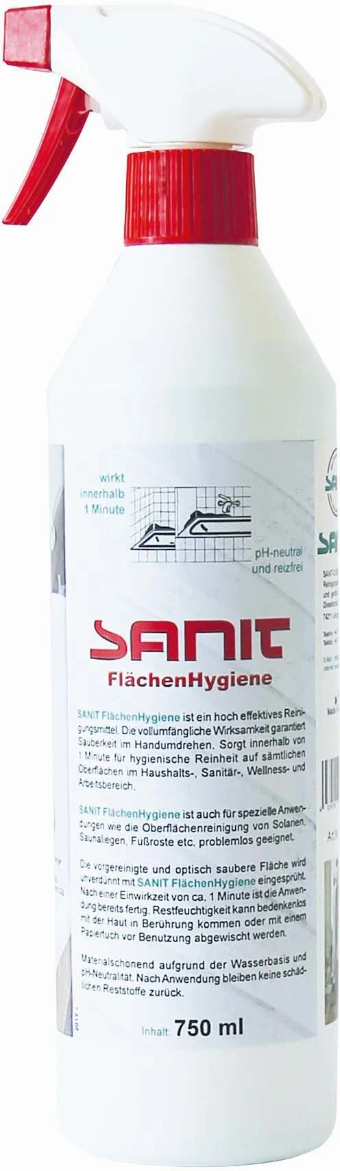 - SANIT FlächenHygiene kann auf allen Oberflächen eingesetzt werden, unter anderem: auf allen Oberflächen im Haushalt, Badezimmer, Solarien, Saunaliegen, Fußroste und viele andere mehr…
