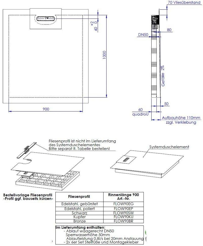 Schedel Line Flow Duschelement LI2KF909010 90 X 100 Cm, Einseitiges Gefälle